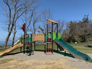 恐竜のすべり台、複合遊具やバーベキュー施設があり、グリーンシーズンにはお子様連れでにぎわいます。