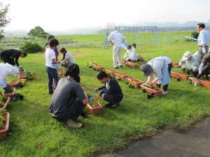 6月2日(日曜日)に、小中学生を中心とした集落のみなさんで、プランターへの植栽を行いました。プランターは集落センターだけでなく、登校時の集合場所である集落内のお寺にも設置しました。集落の人たちが集まる場所にきれいな花々が並び、環境の美化を図ることができました。