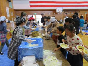 10月27日(日曜日)、九日市集落にて収穫感謝祭が行われました。毎年秋に行われている恒例行事です。その年の収穫に感謝し、新米のおにぎりや豚汁などを食べ、集落住民が親睦を深めました。今年は、カラオケのほかにビンゴゲームを取り入れ、子どもから大人まで幅広い年齢のみなさんが和気あいあいとした雰囲気で過ごすことができました。