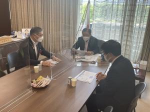 発起自治体を代表し村上市長が「スケートボード競技を応援する議員の会(会員数47名)」の会長である遠藤利明様、会長代理の平沢勝栄様、幹事長の渡辺博道様、事務局長の堀井学様と会談し、「(仮称)全国スケートボード施設連絡協議会」について報告を行いました。